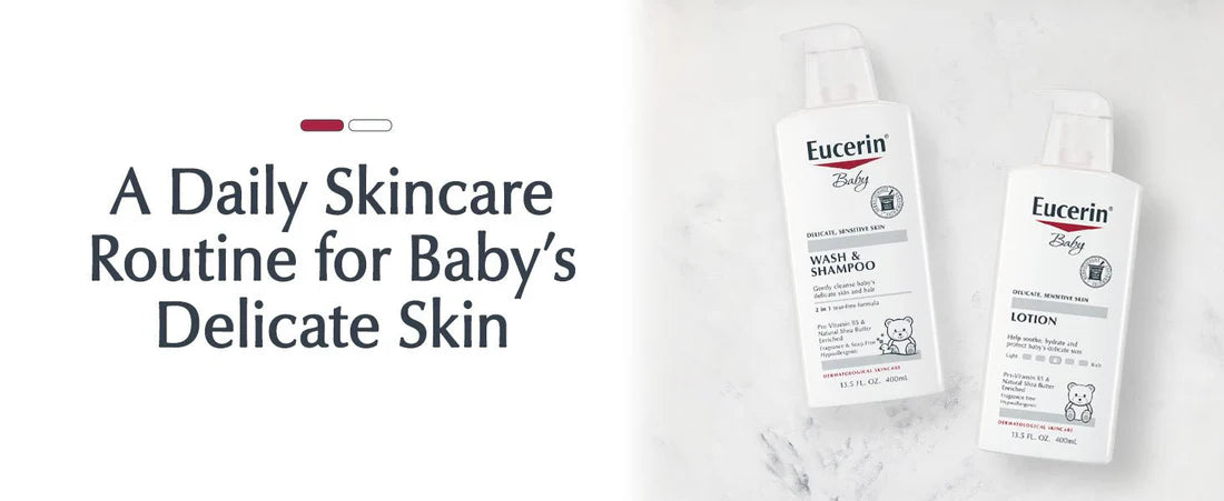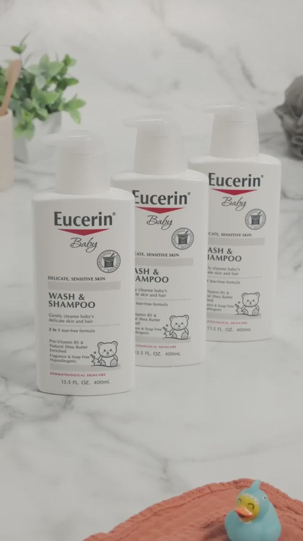 Eucerin Baby Wash & Shampoo – A gentle 2-in-1 formula designed for delicate baby skin and hair, enriched with Pro-Vitamin B5 and shea butter to cleanse without drying or irritation.